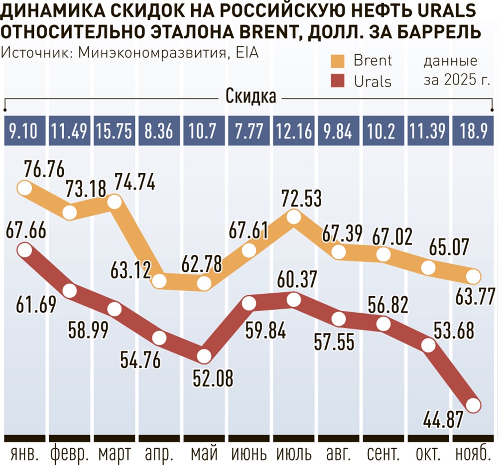 Доцент Андрианов: Дисконт на российскую нефть достиг своего пикаСергей ТихоновСкидка на российскую нефть относительно эталонного сорта Brent достигла максимального значения за два с половиной года, с июня 2023-го. В среднем в ноябре она составила 18,9 доллара с каждого барреля нашего главного экспортного сорта нефти Urals, причем к концу месяца дисконт уже превысил 20 долларов.